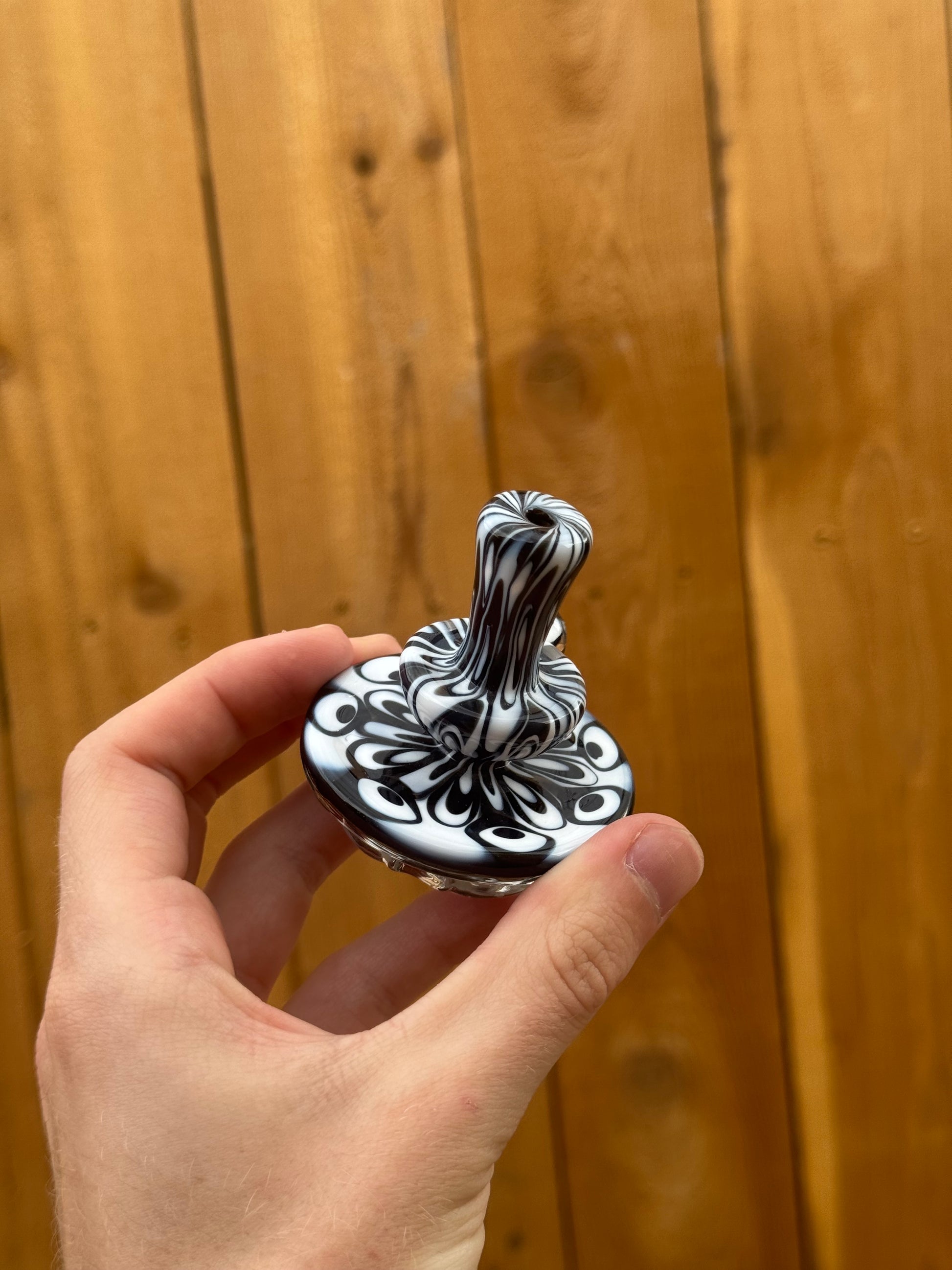 This puffco dry top features a dotstack pattern by Indo glass and beautiful shaping by Geoffmade. It also features a puffco logo millie on the dry top. You can get this online or at 2039 airport blvd, Austin, Texas.