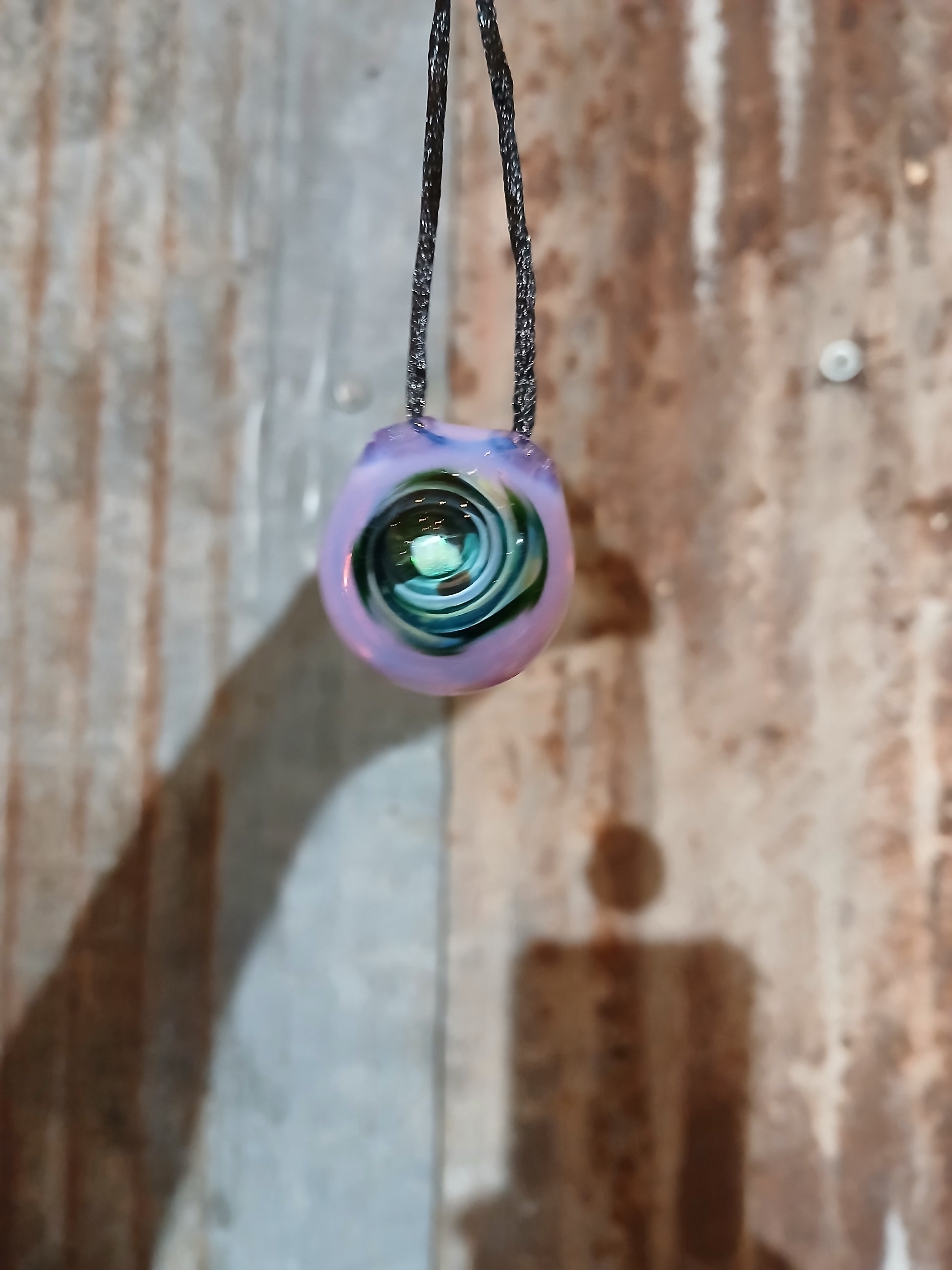 This vortex pendant features a pink slyme body, and a stunning opal! It was made in Austin, Texas by TheGlassmithBilly using his signature GTT phantom torch.