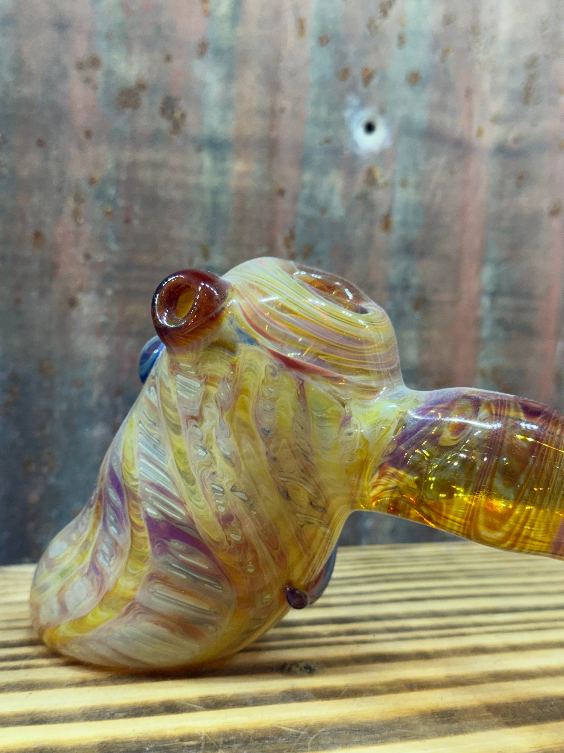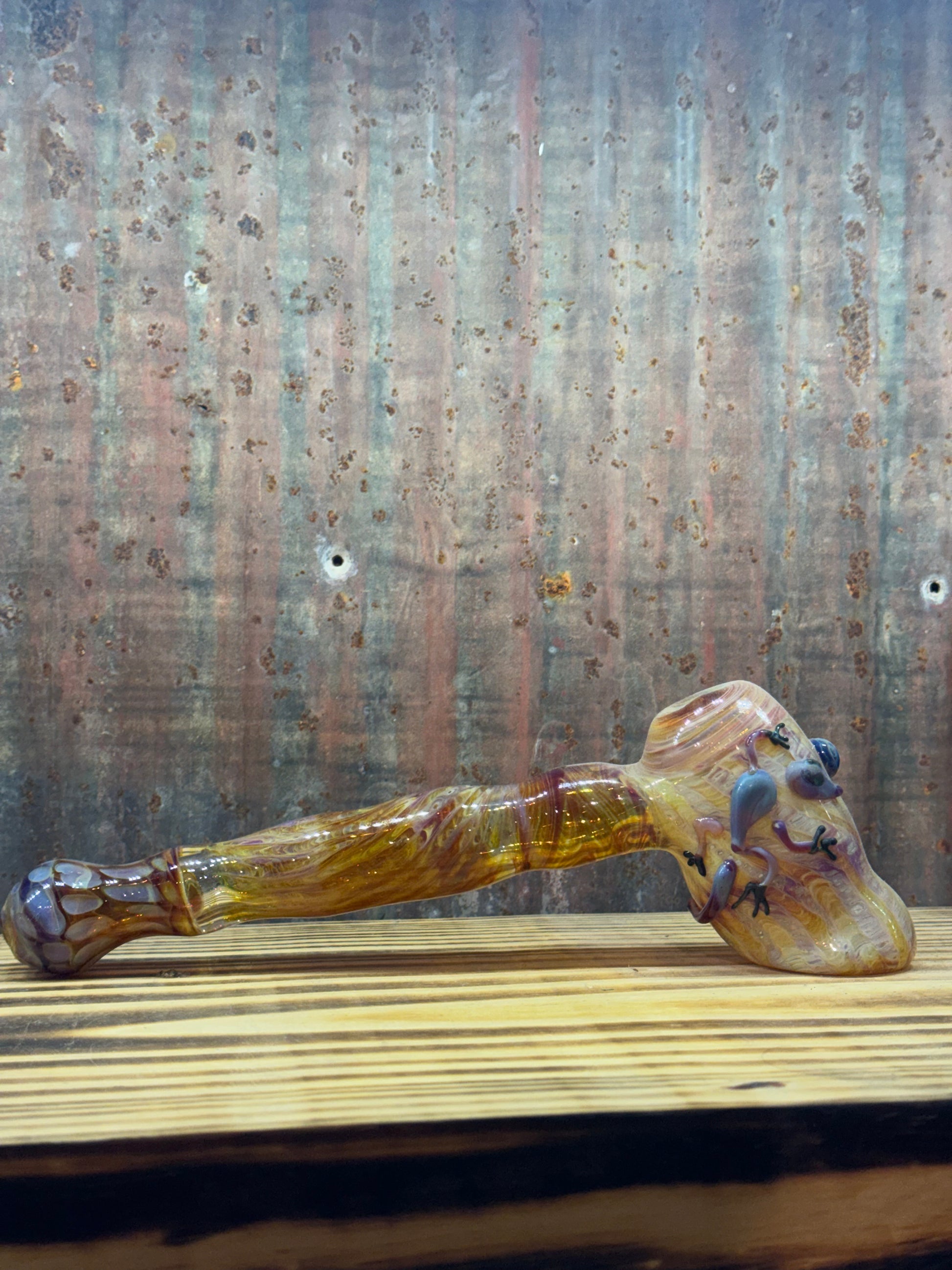 This Hammer Pipe was made by The Glassmith Billy and Jerome Baker at the Taste of Texas Hemp Cup! The features multiple Amber purple and fume sections by Billy, and it was fully assembled by Jerome Baker!