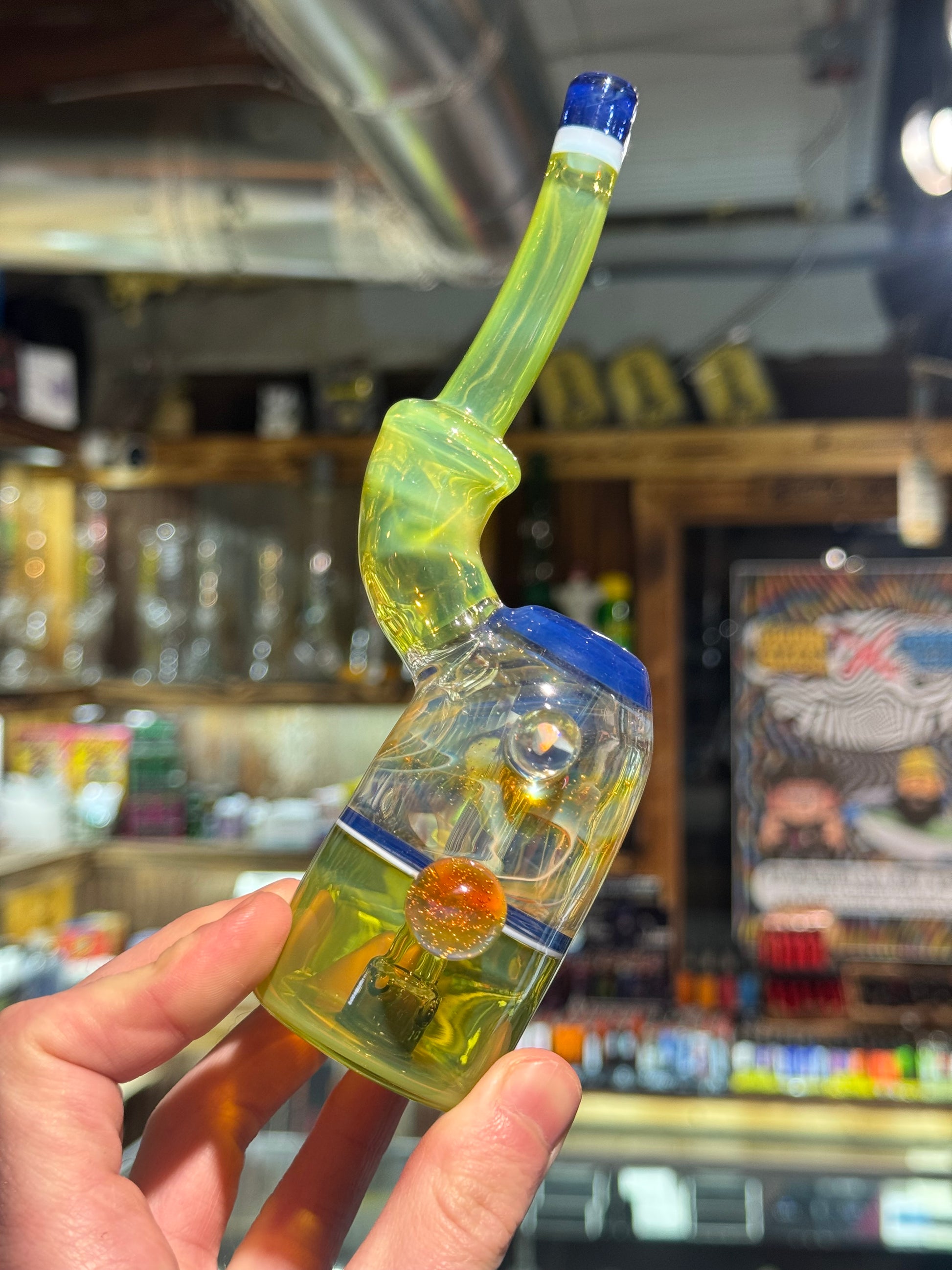 This mini rig features a chunk of King Leo’s silver fume prep, sonic lip wraps and an exp green opal body and mouth piece.