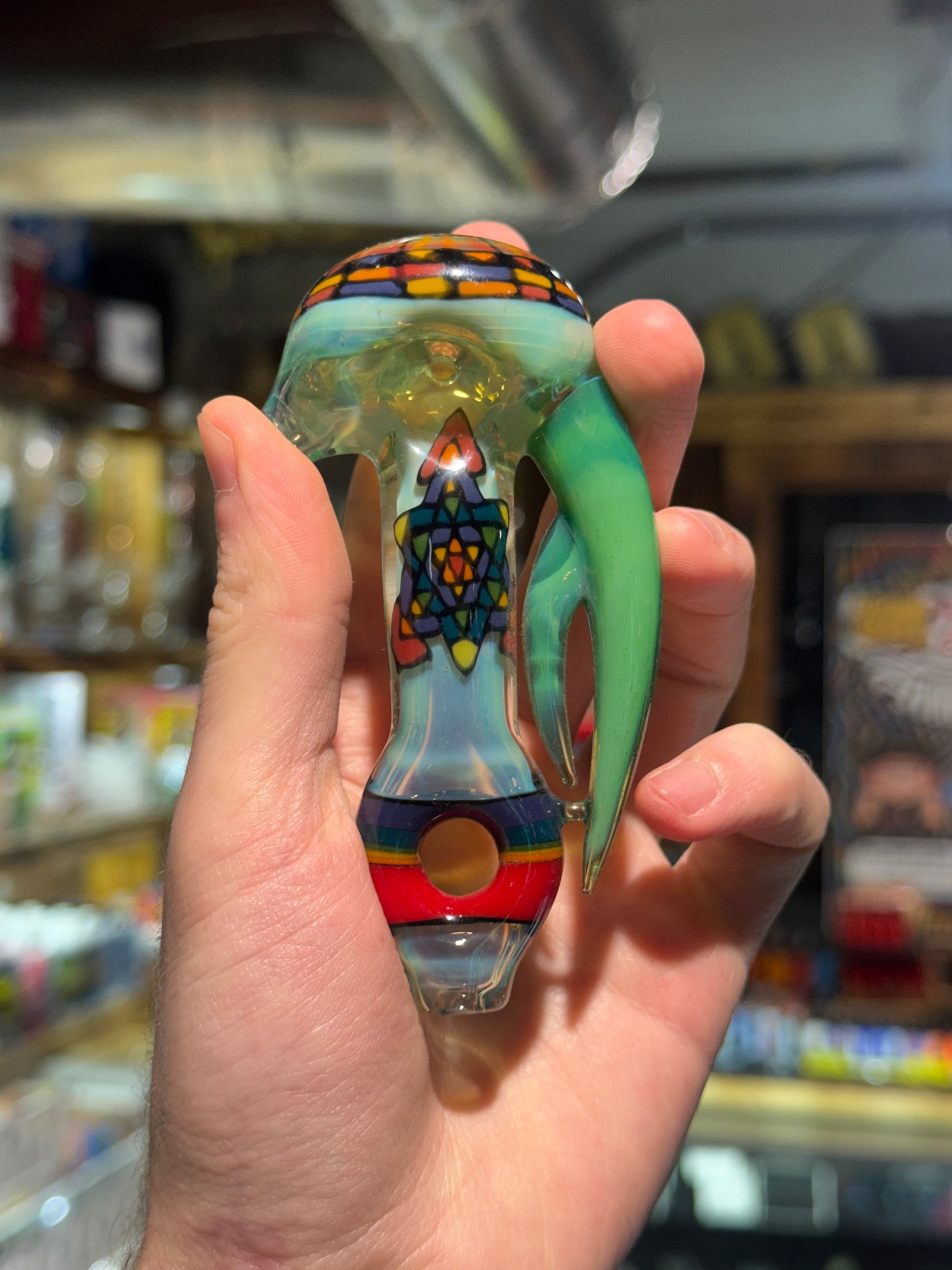 This spoon was made by Scott Ratner is Austin Texas during our spoon competition! It features 2 flipped sections with drawn patterns, and a dual hooked horn. This piece feels great in the hand, and looks amazing on any shelf!