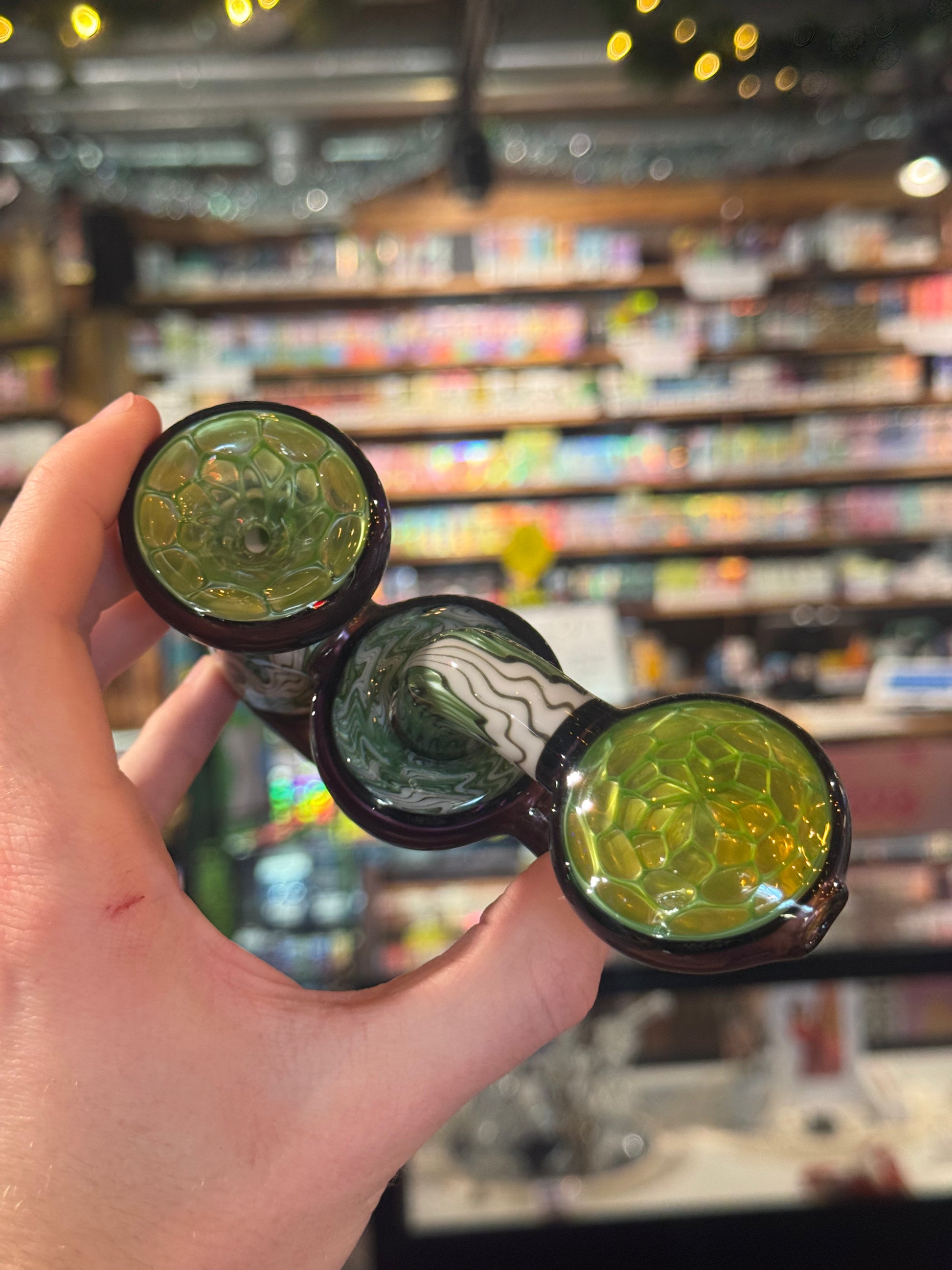 Smitty and Sir Pyro pieced this pipe together in Austin, Texas! It features chromium honeycombed with ion, giving it a pop of UV green, and white satin and chromium liner sections by Smitty!